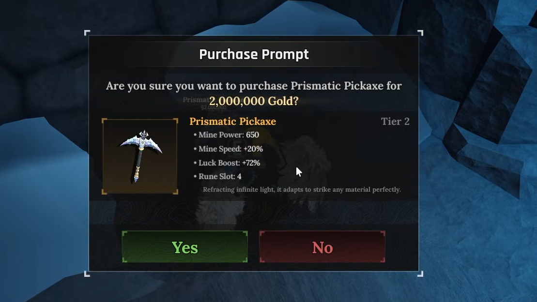 For comparison, the best shop pickaxe on Island 3, the Void Pickaxe, offers 550 Power, -5% Speed, +68% Luck, and three rune slots for 1,350,000 Gold. The Prismatic Pickaxe adds 100 more Power, flips the speed penalty into a 20% bonus, slightly improves Luck, and opens a fourth rune slot. The tradeoff is cost: fully slotting four runes on a 2M Gold tool is significantly more expensive than on cheaper picks.