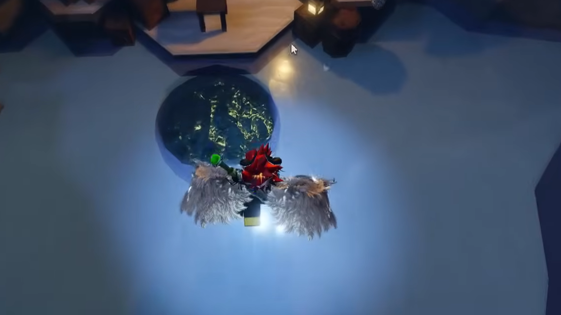 Step 4: Equip your strongest pickaxe, return to the frozen lake, drop down through the ice hole again, and attack the frozen fish/ice rock. Once your base mining damage is high enough, the barrier breaks, opening the path to the Prismatic Pickaxe pedestal.