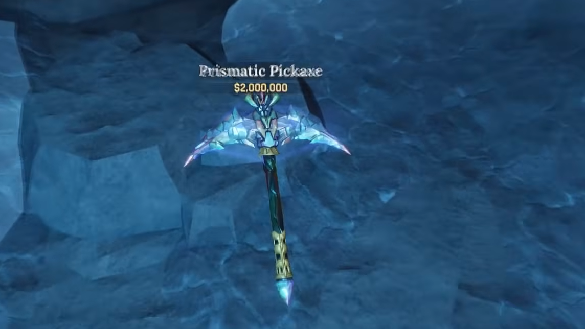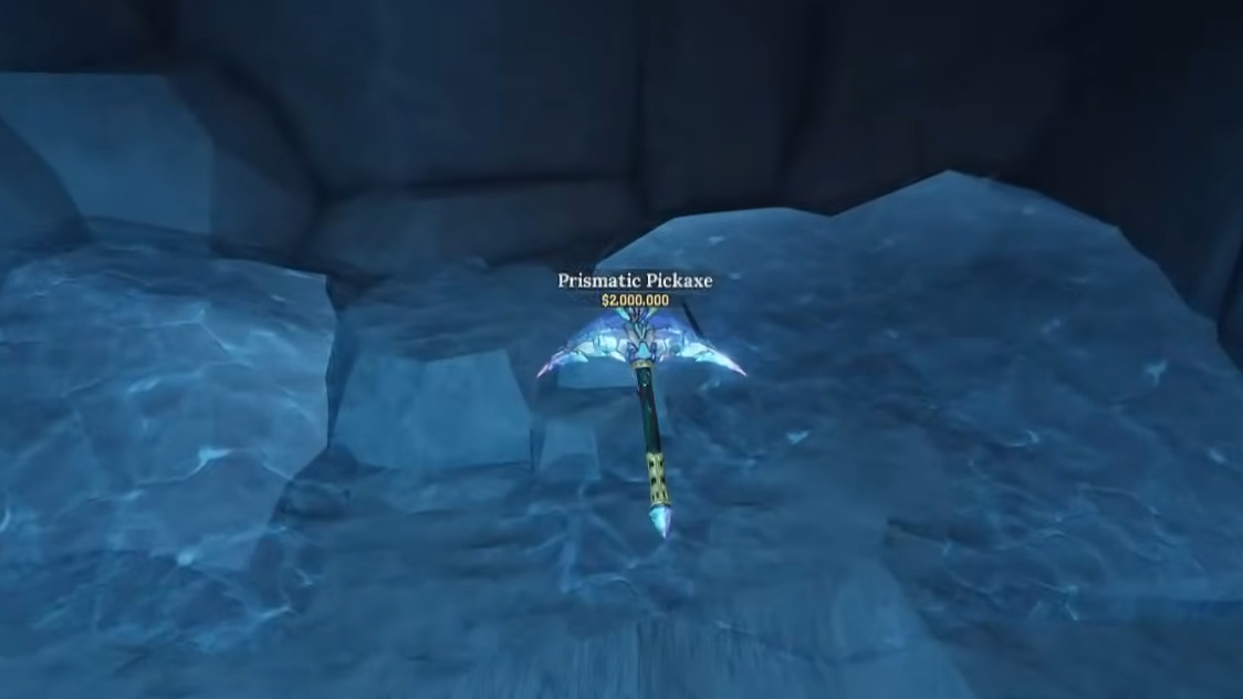 The Prismatic Pickaxe is not sold in any standard shop. It is hidden in a frozen underground chamber beneath a lake near the hub.