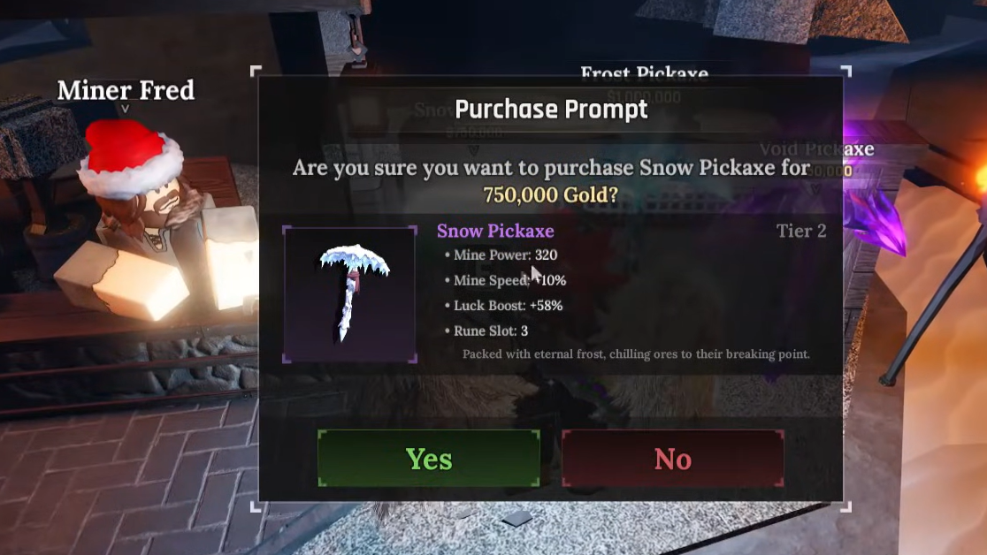 Step 2: Visit Fred the Miner’s pickaxe shop in the center of Frostpire Expanse. This brightly lit shop sells the new Island 3 pickaxes, scaling from Tungsten up through Void. Work your way at least to the Snow Pickaxe, which provides 320 mining power.