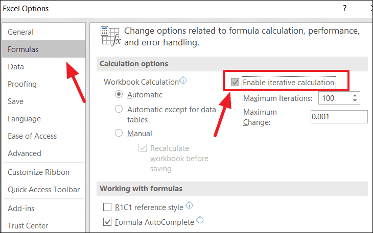 In the Excel Options window, choose 'Formulas' from the sidebar. Under the 'Calculation options' section, check the box labeled 'Enable iterative calculation'. Click 'OK' to apply the changes.