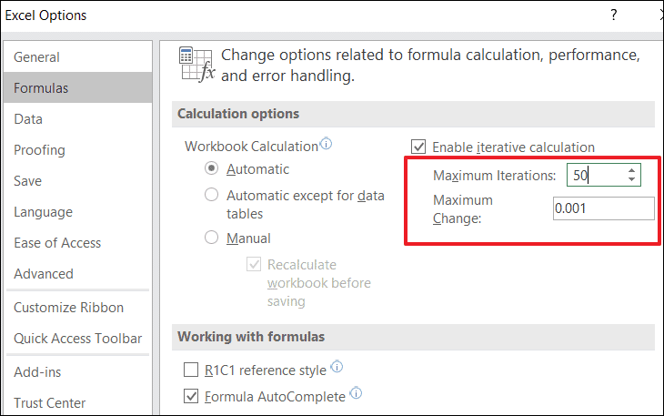 - Maximum Change: Defines the smallest change between calculation results. Smaller numbers increase accuracy but may require more iterations.