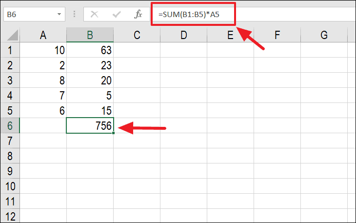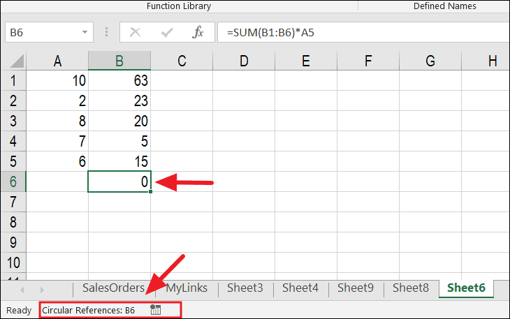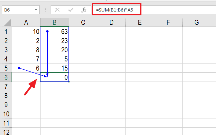In the example below, the blue arrows indicate that cell B6 depends on cells B1 through B6 and A5. Since B6 is included in its own calculation, it creates a circular reference.