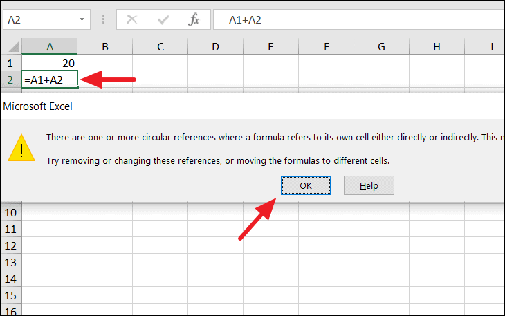 After this warning appears, you can click 'Help' to learn more about the error or 'OK' to dismiss it. The result of the formula will typically display as zero. Circular references can lead to miscalculations and may slow down your worksheet's performance, so it's important to resolve them promptly.