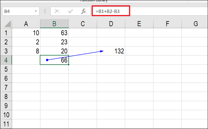 In the example below, cell D3 depends on the value in B4. The arrow indicates that changes in B4 will affect D3.