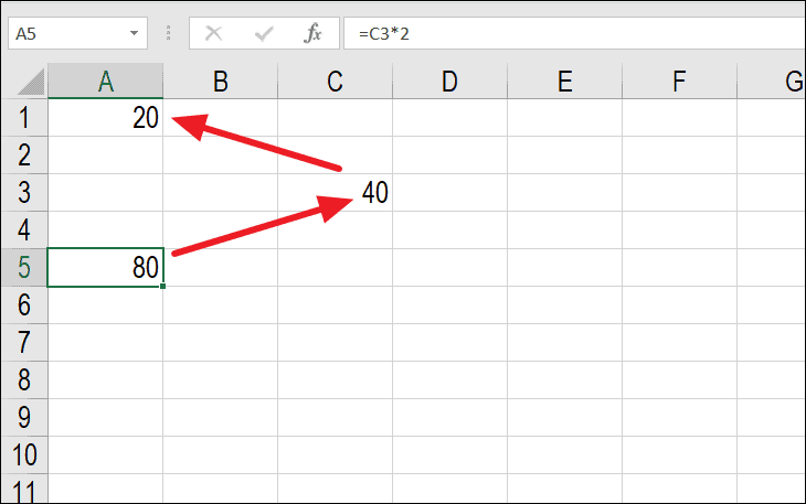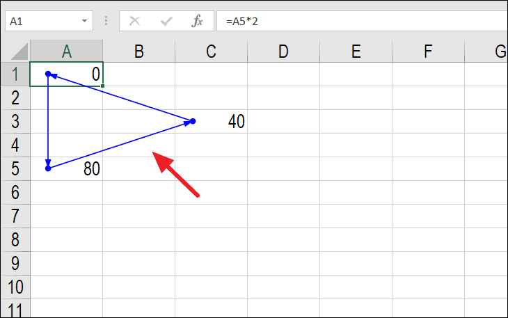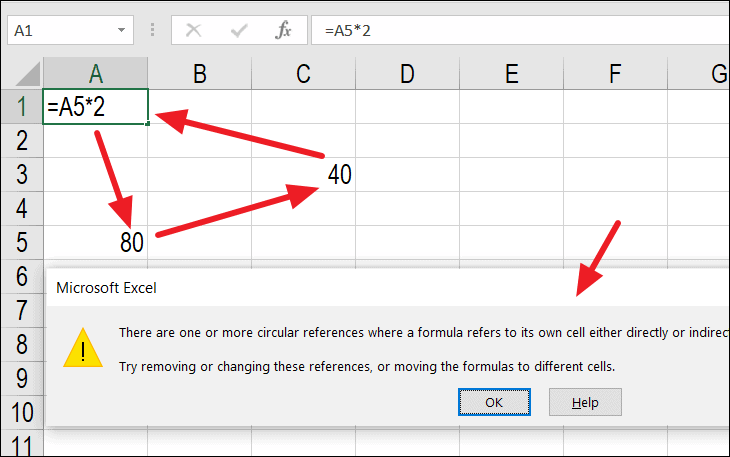 Now, if you replace the value in cell A1 with a formula that refers to A5, like =A5*2, a circular reference is created because A1 depends on A5, which in turn depends on C3, which refers back to A1.