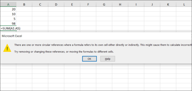 Consider a scenario where you have numbers in cells A1 through A4 and you use the SUM function in cell A5 with the formula =SUM(A1:A5). Here, A5 is included in the range of the SUM function that's placed in A5 itself, creating a direct circular reference. Excel will display a warning message indicating a circular reference has been detected.