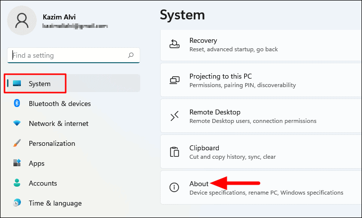 - In the Settings window, ensure you're in the 'System' tab, then scroll down on the right and click on 'About'.