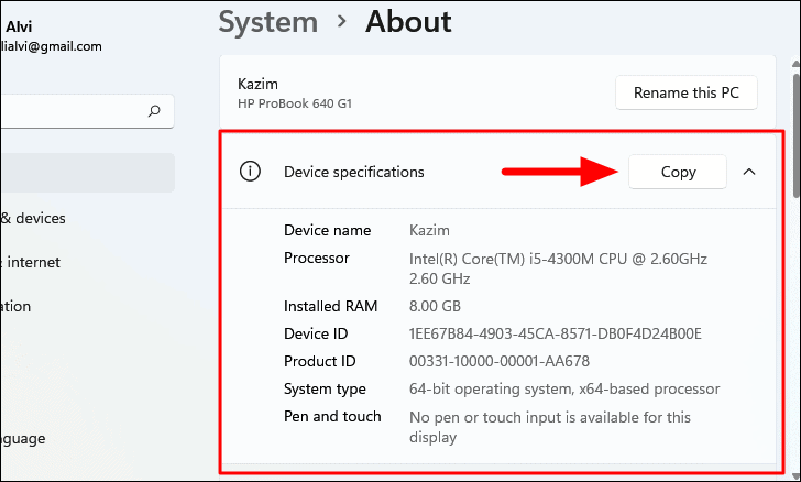 You'll find the basic device specifications at the top, including your processor, installed RAM, device ID, and more.