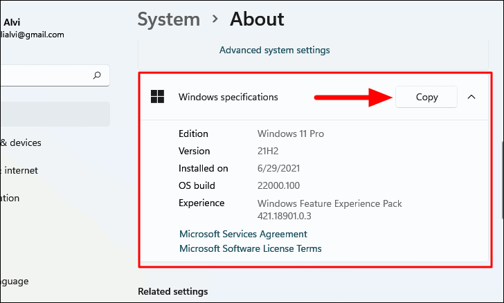 Below the device specifications, you'll find Windows specifications, including the edition, version, and OS build number.