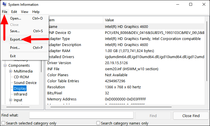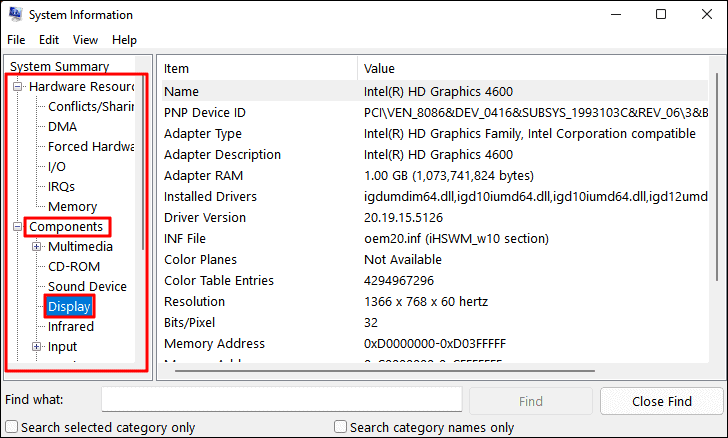 - Use the navigation pane on the left to explore specific components like 'Display' under 'Components' for detailed information.