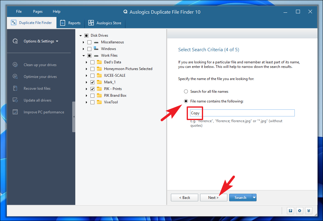 Step 10: If you're searching for duplicates of a specific file, you can enter the file name or part of it in the text box after selecting 'File name contains the following'. Otherwise, you can leave this option and proceed by clicking 'Next'.