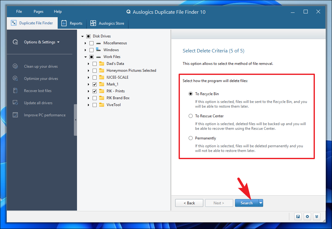 Step 11: Choose what you want to do with the duplicate files found. You can select options like sending them to the Recycle Bin, deleting permanently, or moving them to a specified folder. After making your choice, click 'Search' to begin scanning.