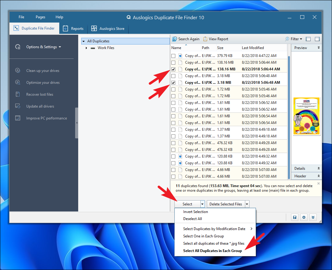Step 12: Once the scan is complete, the results will be displayed. You can preview files by clicking on them and select the duplicates you wish to delete by checking the boxes next to them. To select all duplicates in each group, click on the 'Select' button, then choose 'Select All Duplicates in Each Group' from the dropdown menu.
