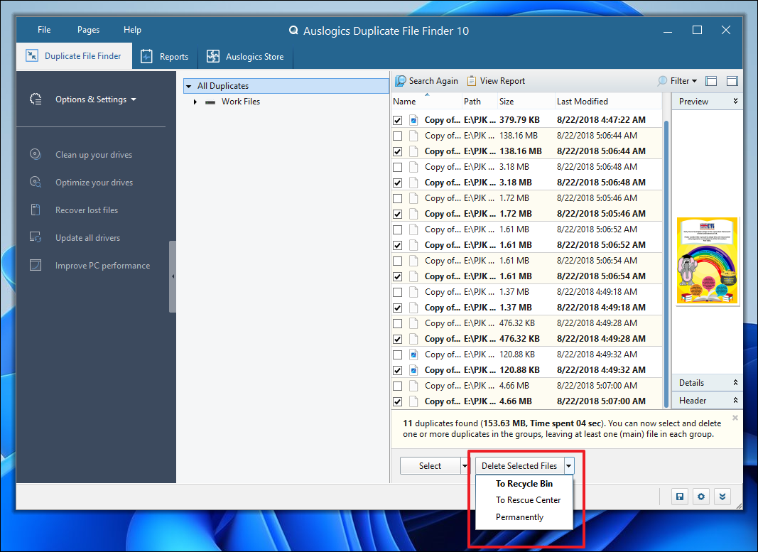By following these steps, you can efficiently identify and eliminate duplicate files using a third-party application. Auslogics Duplicate File Finder is free to use and doesn't impose any limitations on file deletion, making it a practical choice for managing duplicates.