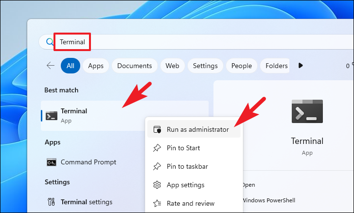 Step 2: Open the Start Menu, type 'Terminal' in the search bar, and right-click on the 'Terminal' app in the results. Choose 'Run as administrator' to open the terminal with elevated privileges.