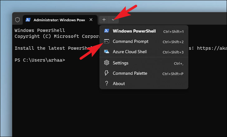 Step 4: In the terminal window, click the dropdown arrow and select 'Command Prompt' to open a new Command Prompt tab.