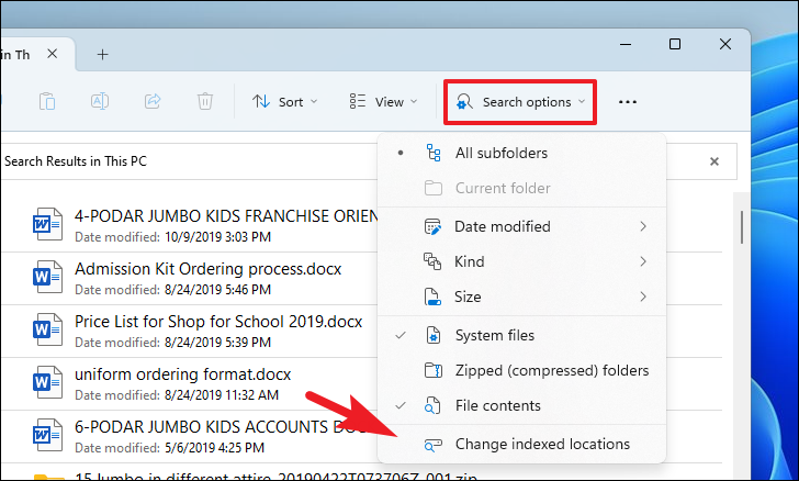 Step 4: If you notice that some folders or drives are not included in the search results, they might not be indexed. To include them, click on 'Search Options' and select 'Change indexed location'.
