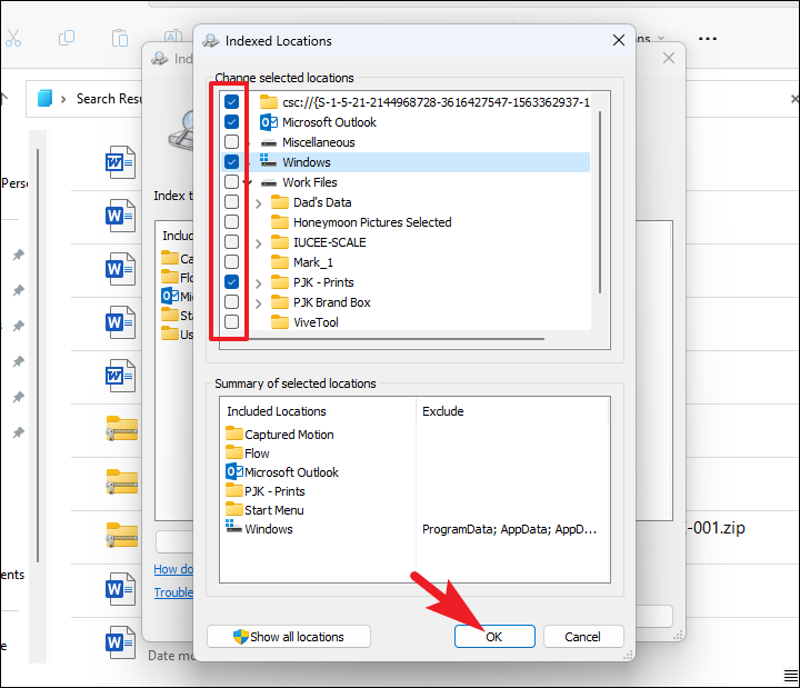 Step 5: In the Indexing Options window, click 'Modify'. A list of folders will appear. Check the boxes next to the drives or folders you want to include in the search index. Click 'OK' to save your changes.