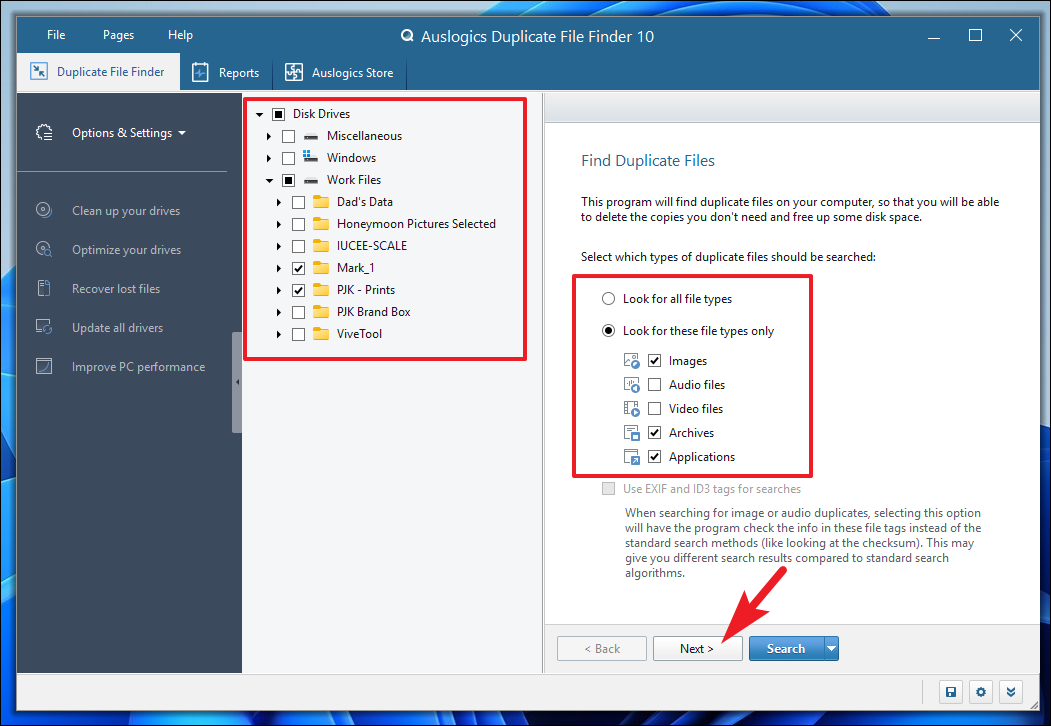 Step 7: On the main screen of the application, you can select the drives or folders you want to scan by checking the boxes next to them. If you wish to scan for specific file types, choose 'Look for these file types only' and select the desired file types. Once you've made your selections, click 'Next'.