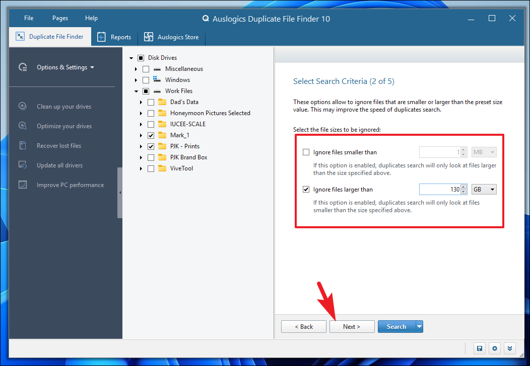 Step 8: By default, the program excludes files smaller than 1 MB. If you want to adjust this setting, you can change the size limit or uncheck the option to include all file sizes. You can also specify a maximum file size if needed. After configuring these options, click 'Next'.