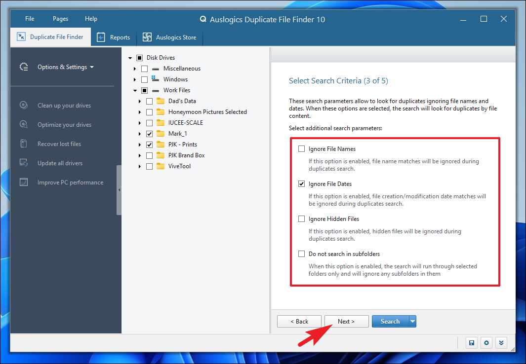 Step 9: In the next step, you can set additional search criteria. You can choose to skip hidden files and folders or skip subfolders within selected directories. Options like 'Ignore File Names' and 'Ignore File Dates' allow you to broaden or narrow your search scope. After adjusting the settings, click 'Next'.