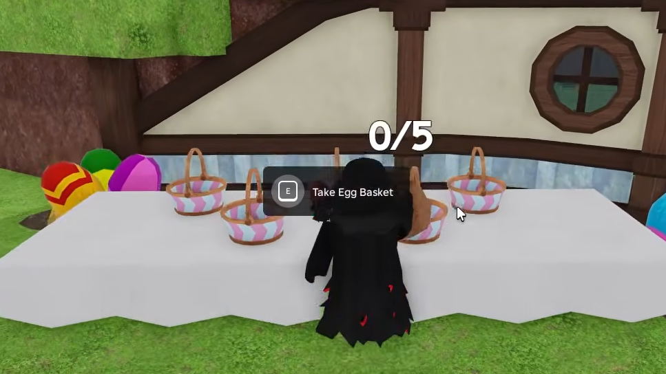 Before you can collect anything, walk to the Easter event area to your left after spawning and pick up an Egg Basket from the table. The basket functions as a dedicated pouch that holds up to 12 eggs at once. Without it, eggs cannot be picked up or turned in.