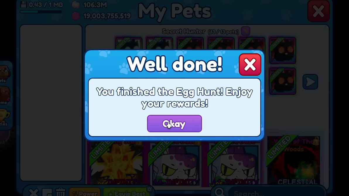 Beyond the nine-egg hunt, a Secret Easter Egg can be found on Dark Egg Island. This is a limited hatchable egg available from March 27th through April 17th, 2026. It drops from the Secret Easter Egg Pickup on the island. Unlike most eggs, the Secret Easter Egg is not affected by Luck boosts, so stat stacking won't help your hatch odds here.