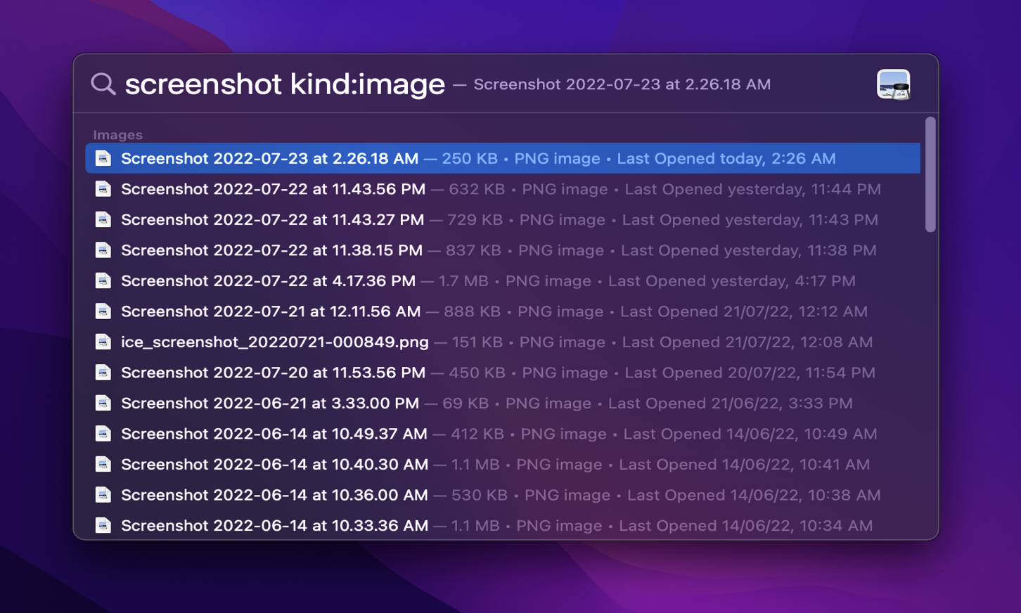 Then, type the keyword/ filename you are looking for, followed by kind: and then the type of file you are looking for. For example, type ‘png’ for images with the .png extension.
