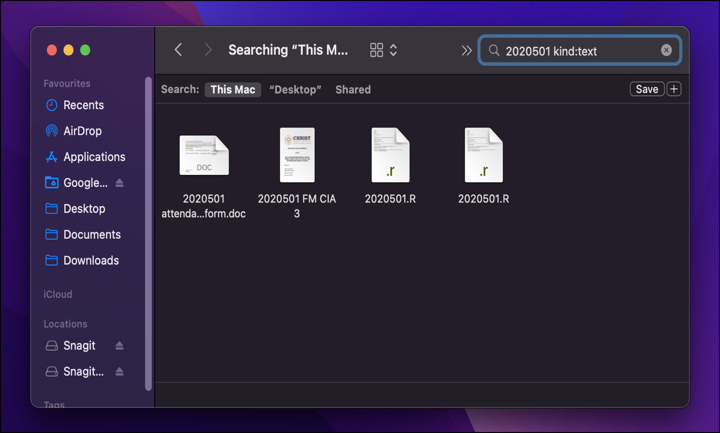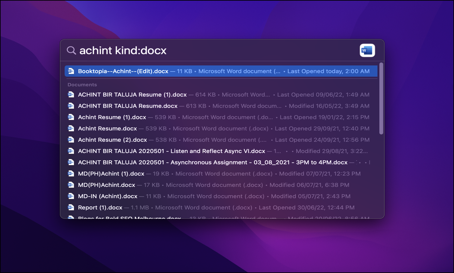 Next type the keyword (file name) you are looking for, followed by the words kind: and then the type of file you are looking for. For example, ‘docx’ is the extension for Word documents.