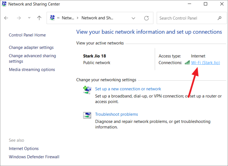 - In the Network and Sharing Center, click on your network connection next to Connections.