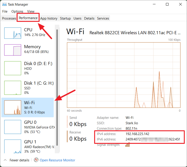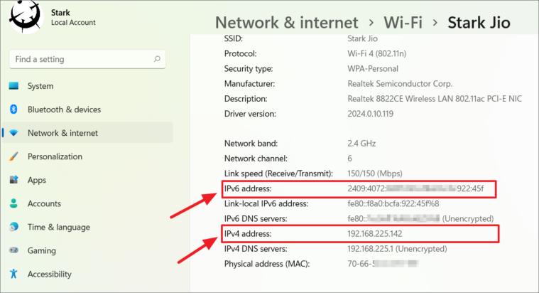 - Your IPv4 and IPv6 addresses will be displayed in the right pane, along with other network statistics.