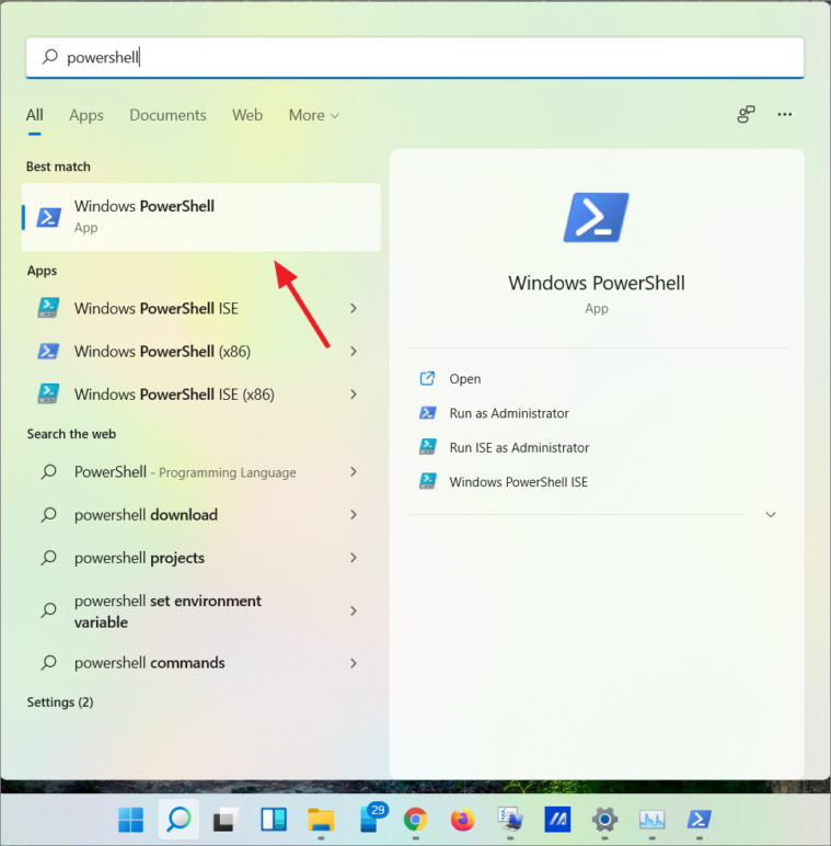 - Search for PowerShell in the Windows search bar and open it.