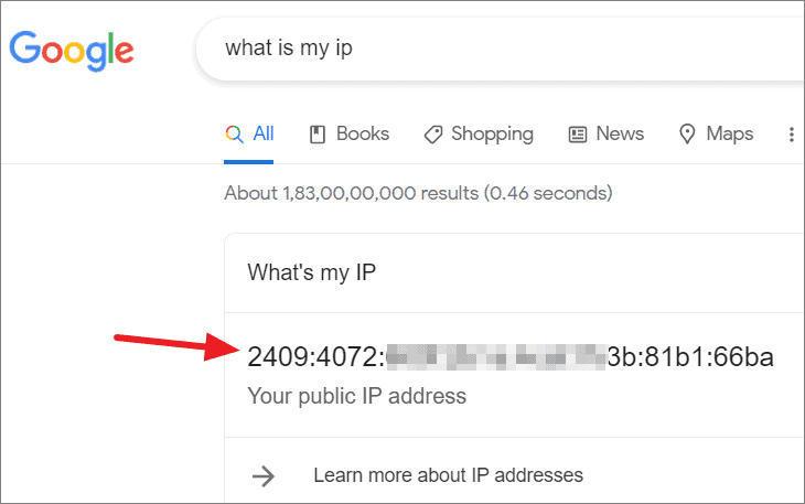 Your public IP address will be displayed at the top of the search results.