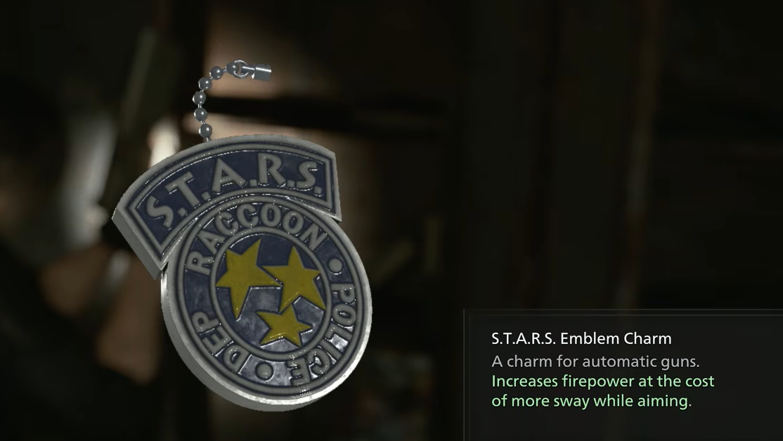 | S.T.A.R.S. Emblem Charm | Increases firepower on automatic weapons (e.g., the submachine gun) but adds more weapon sway while aiming. |