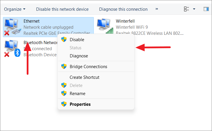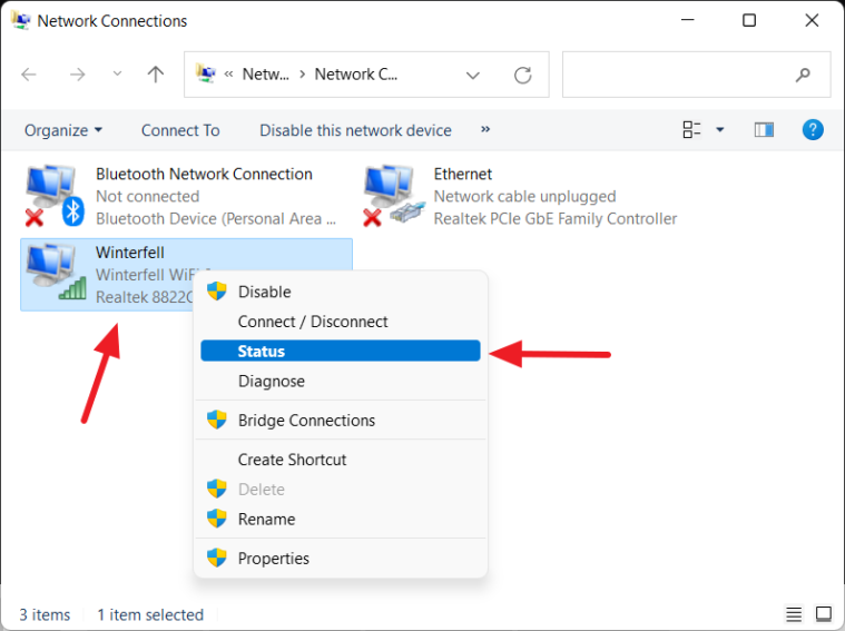 Note: This method only works if the network adapter is currently connected. If it's disconnected, the Status option will be unavailable.