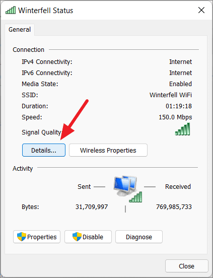 - In the Status window, click on Details.