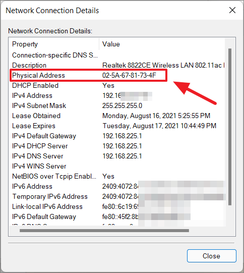 The Network Connection Details window will display various information, including the Physical Address, which is your MAC address.