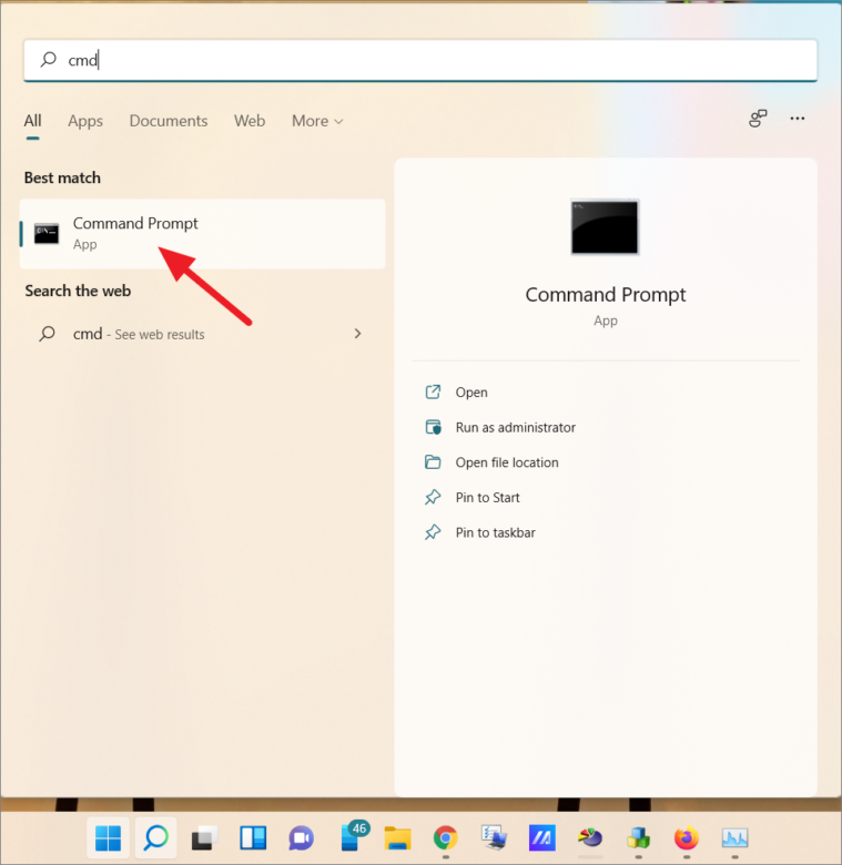 cmdin the search bar. Click on the Command Prompt application to launch it.