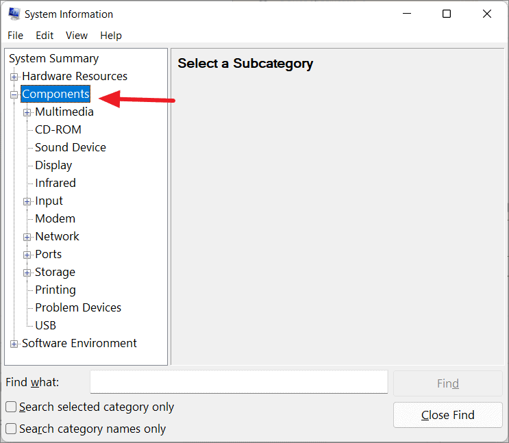 - In the System Information window, expand the Components section on the left.