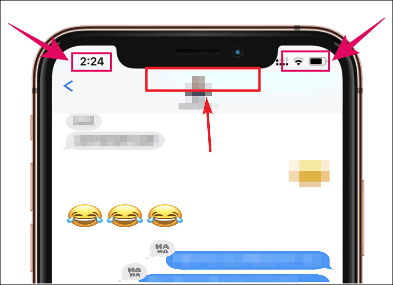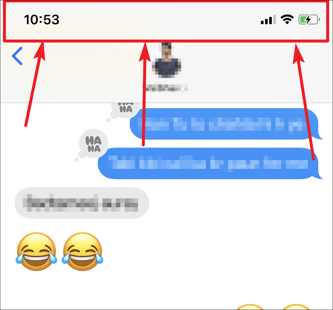 Step 2: Once the conversation is open, tap at the very top of your screen—the status bar displaying the time, battery level, and other status icons. Tapping anywhere on this bar will work, but tapping near the clock is often easiest.