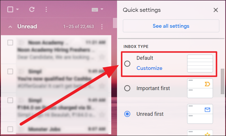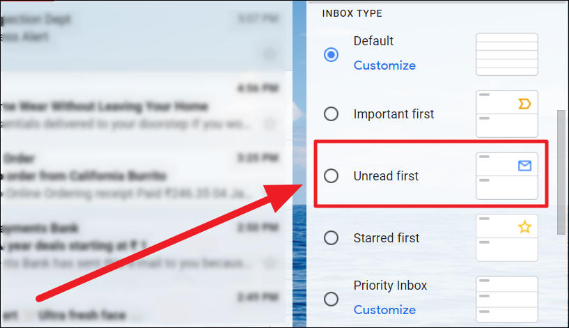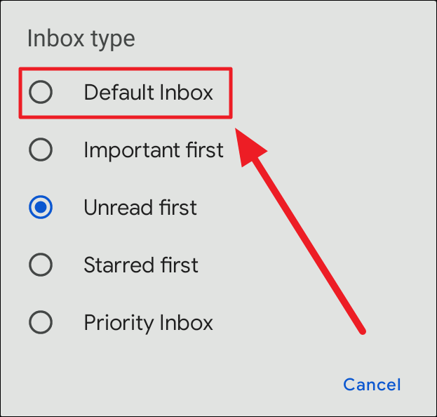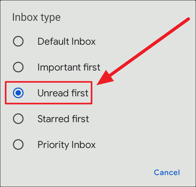 Tap the radio button in front of the ‘Unread first’ option in the following ‘Inbox type’ menu.