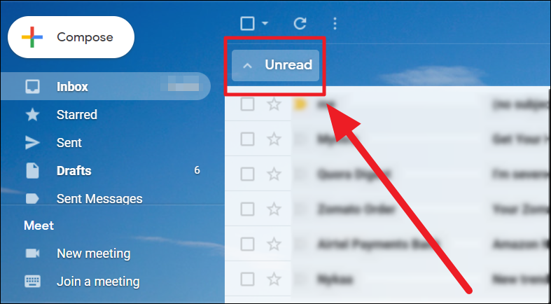 If you want to minimize your ‘Unread’ inbox and take a look at your other emails, click the ‘Unread’ label with an upward-facing arrowhead above the list of unread emails.