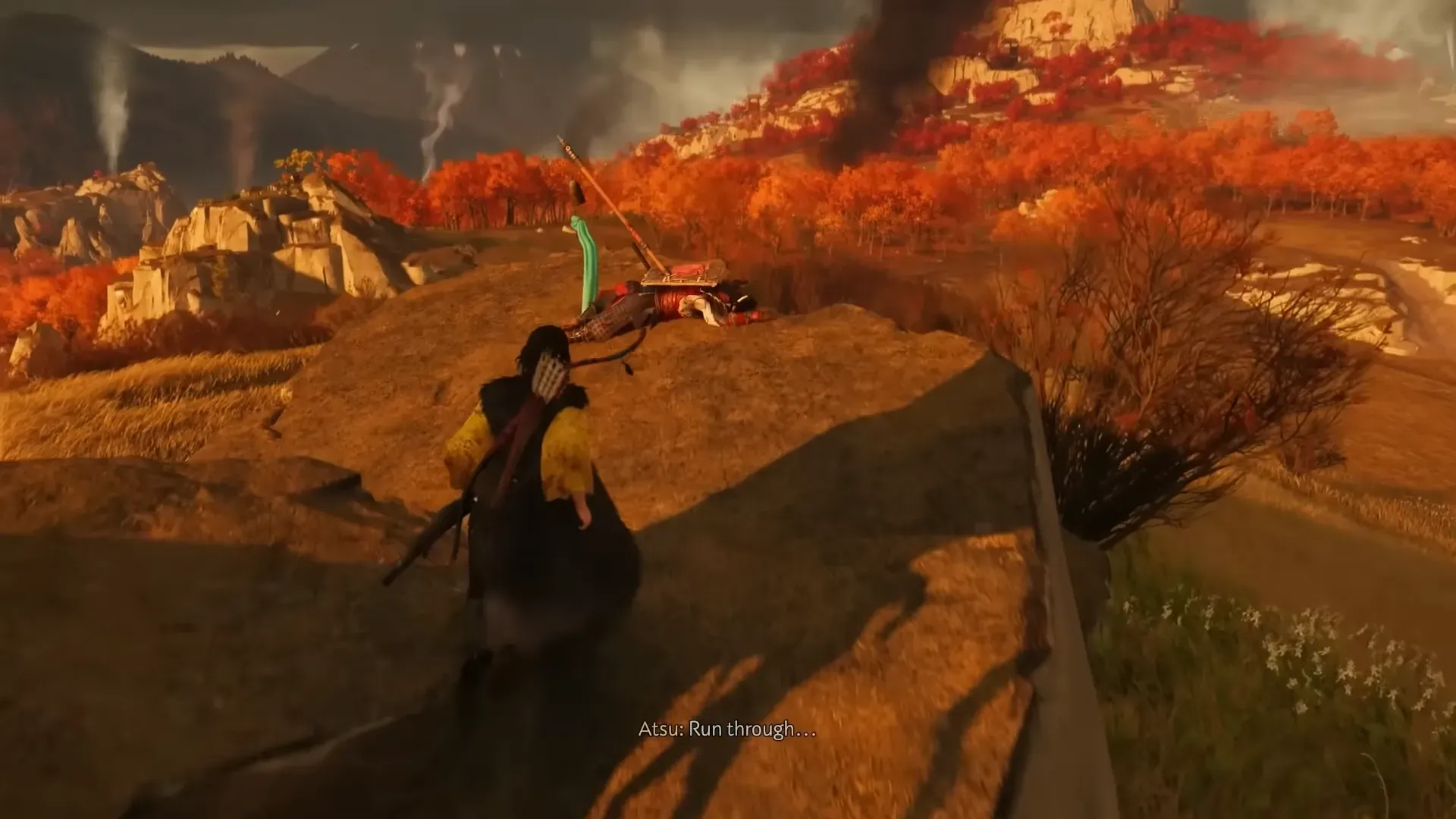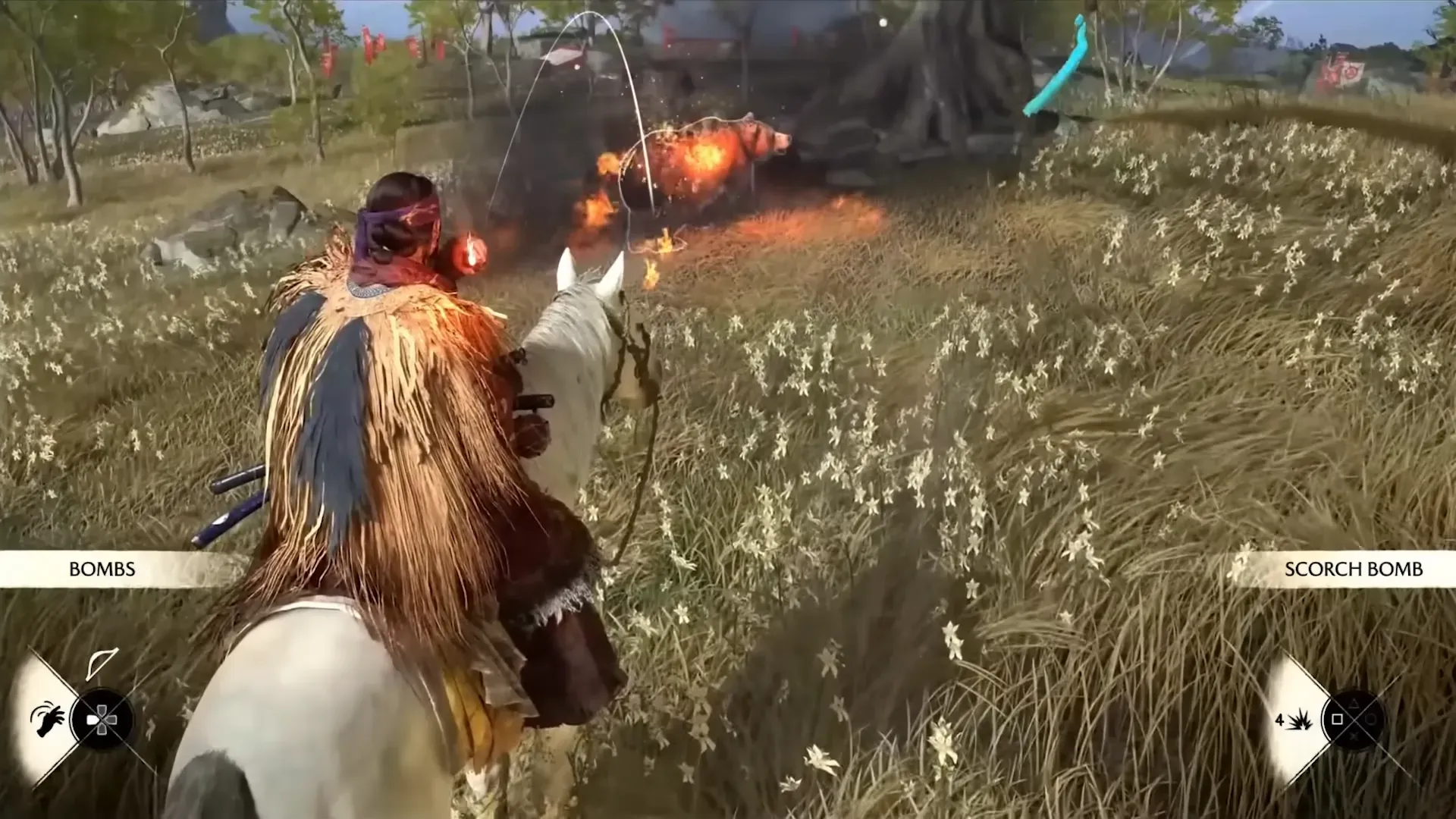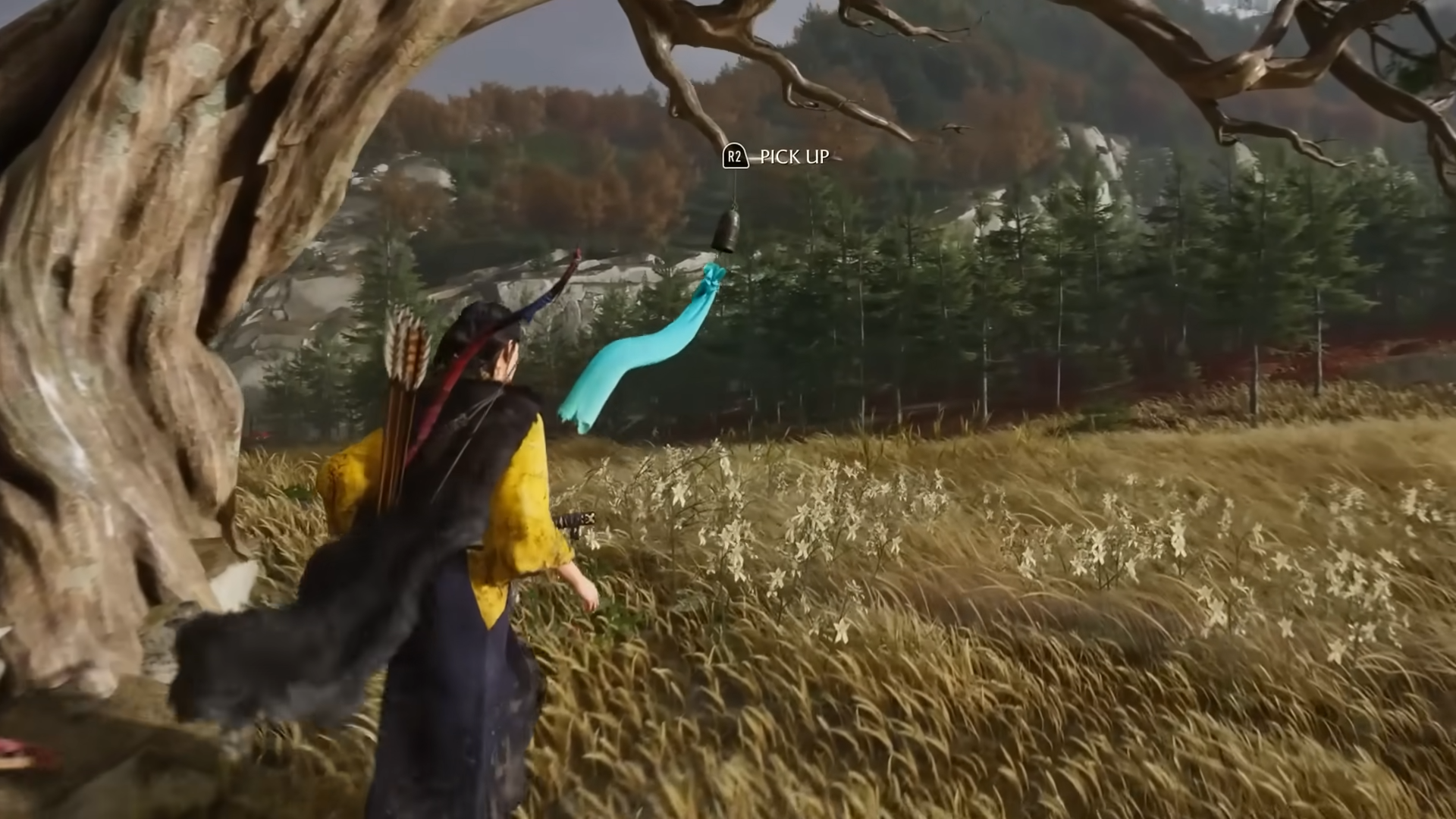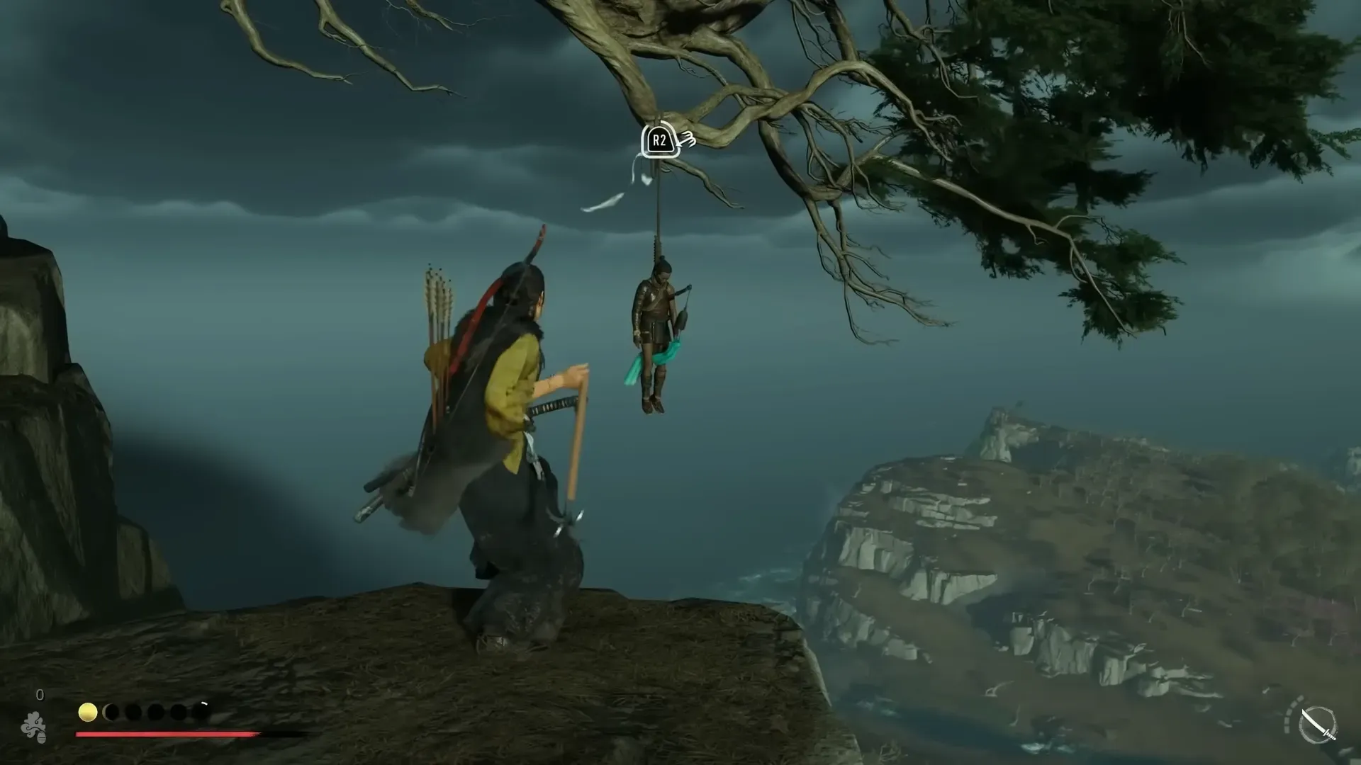 | 3 | West, along a tall cliffside | Approach the hanging corpse and press R2 to throw your grapple and cut it down, then climb down to grab the chime. | Mount up for this trek; the chime drops to a lower ledge. |