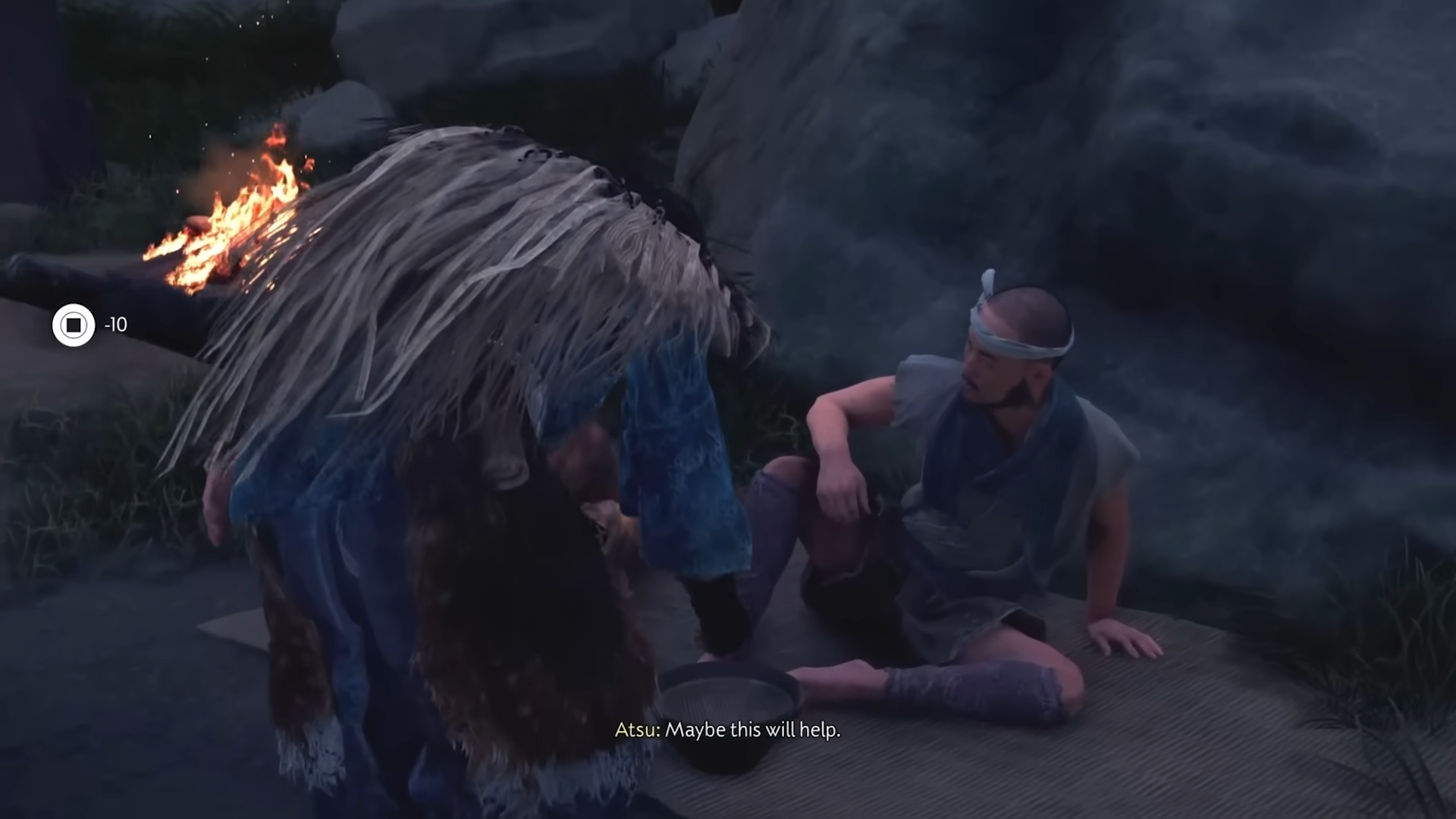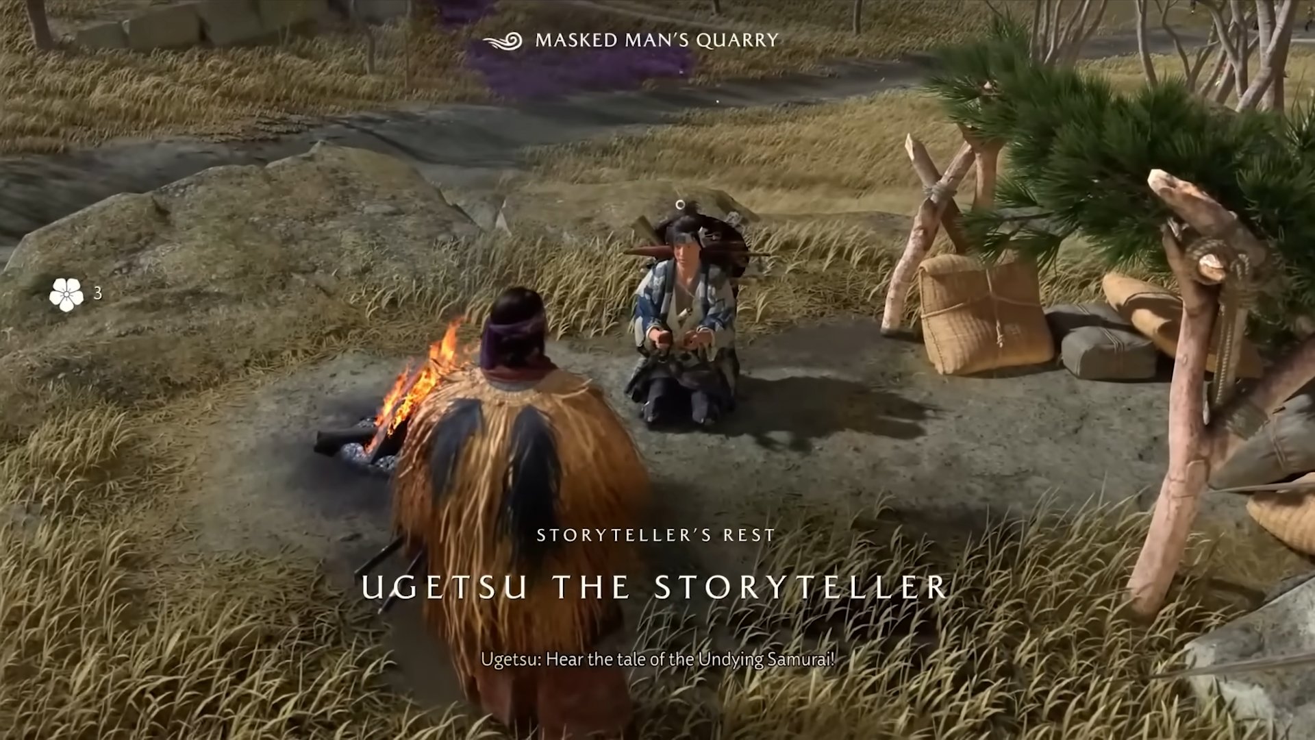 Head north of Nakagoya Spring. Look for a campsite beside a bear mauling site; Ugetsu sits there rhythmically striking wooden blocks. Speak with him to begin the Mythic Tale “The Undying Samurai.” Your task is simple: collect four wind chimes using the guiding wind (swipe up on the touchpad) between each pickup.