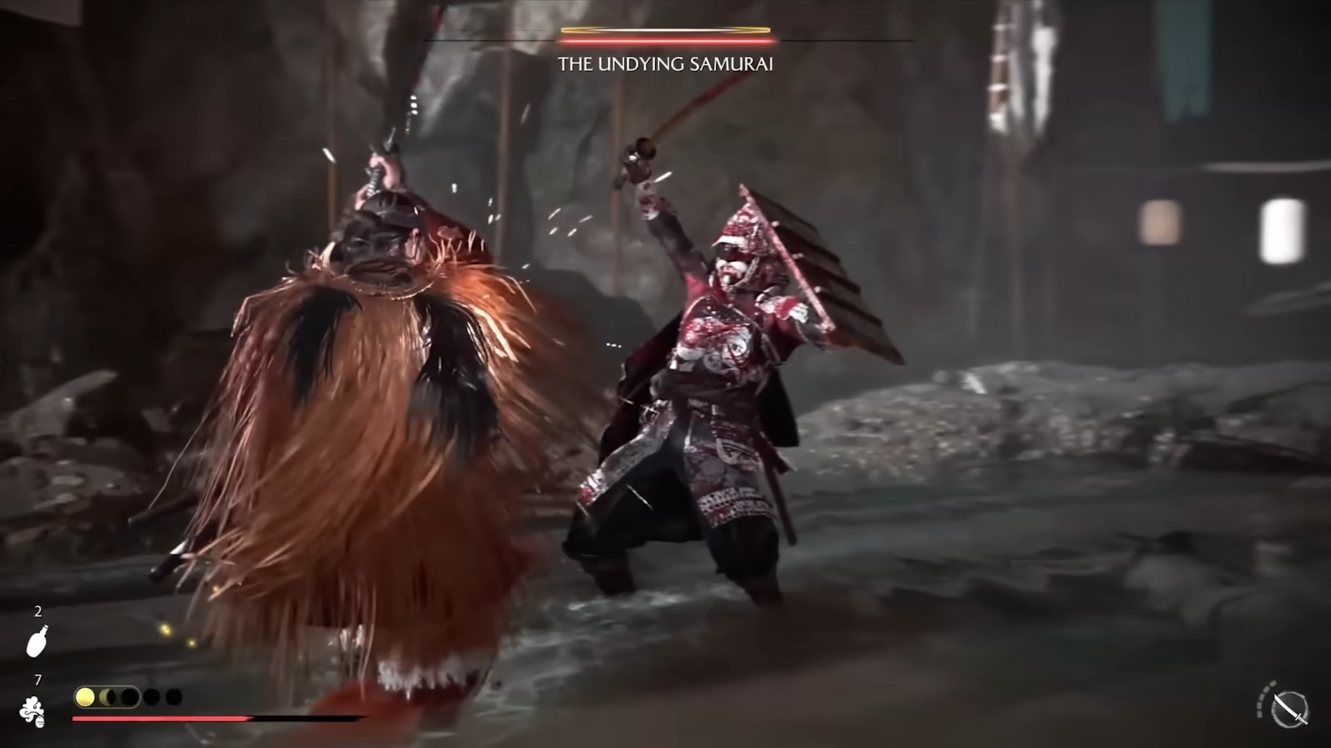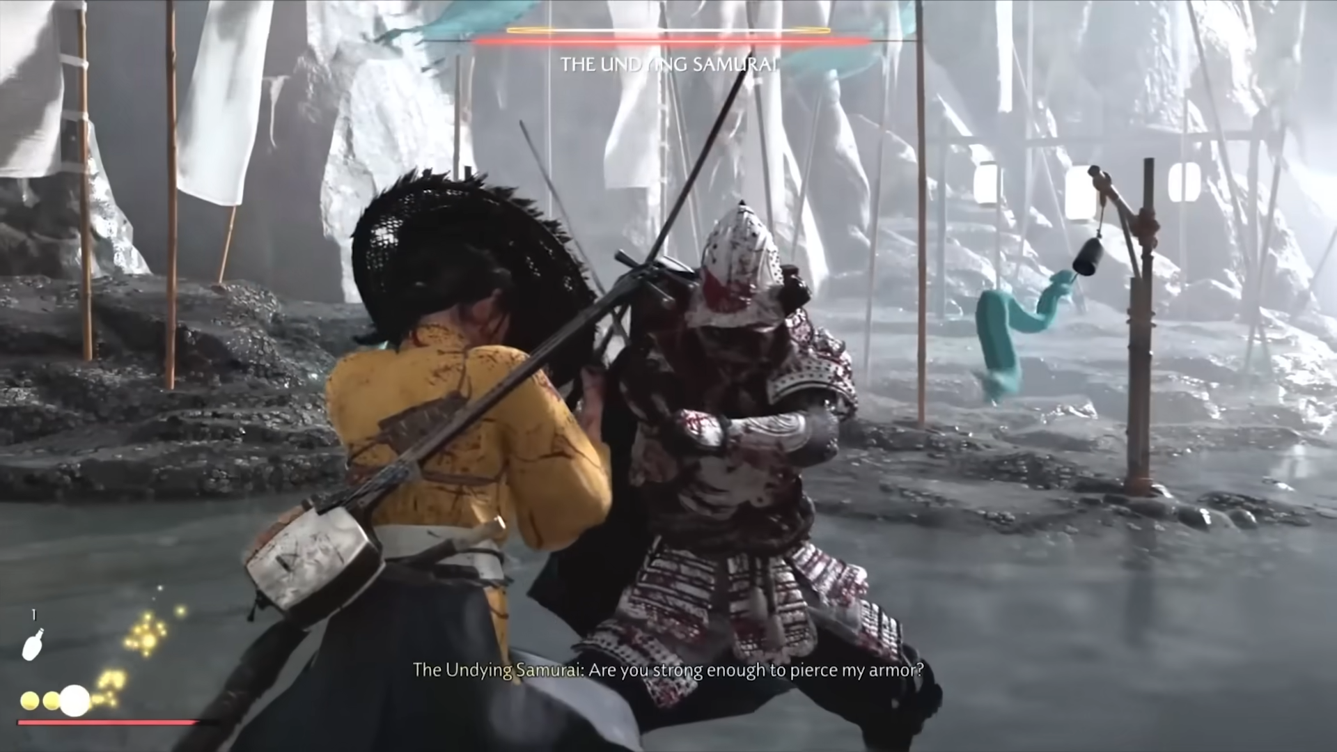 The cave ends in a circular chamber with four wooden posts. Place each chime to summon the Undying Samurai and trigger a duel.