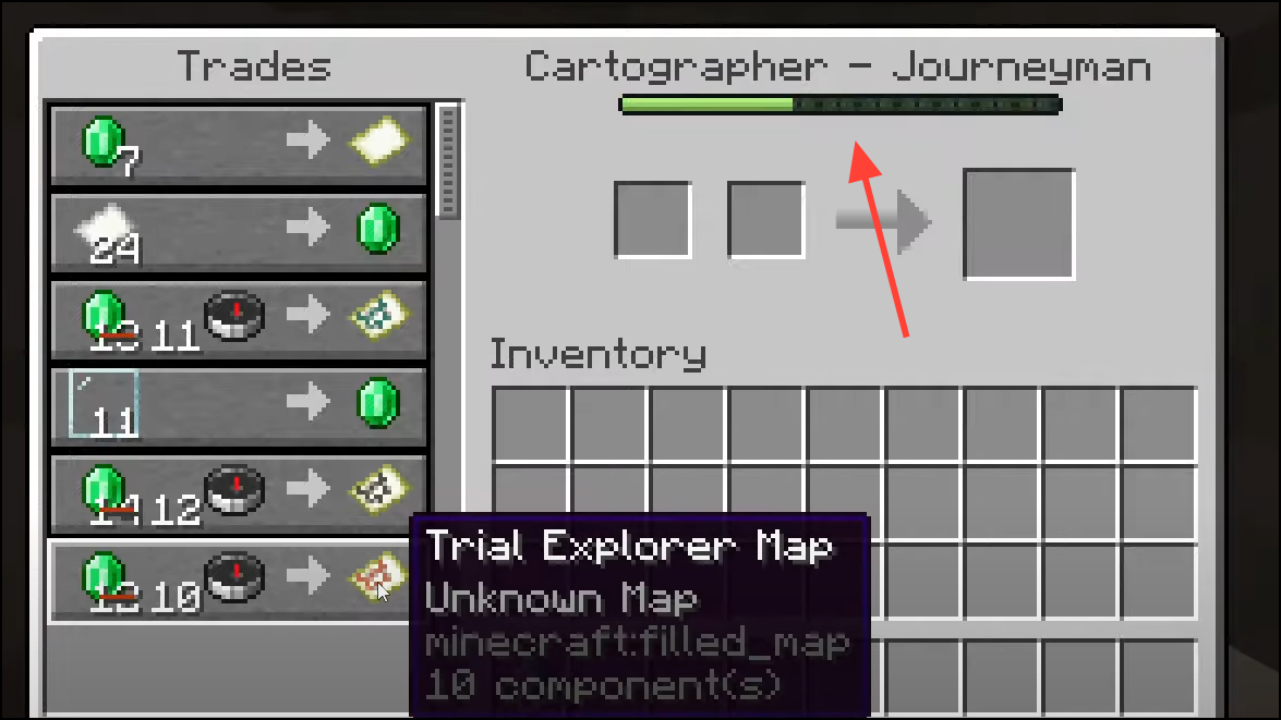 - Journeyman Cartographers sell Trial Explorer Maps that point to a Chamber; emerald pricing and offers vary by villager and discounts.