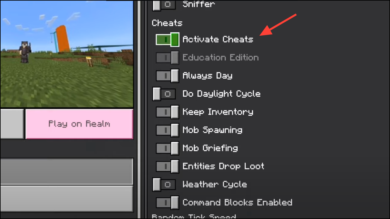 Step 1: Enable cheats. On Java, open your world to LAN and toggle “Allow Cheats: ON”. On Bedrock, enable “Activate Cheats” in Game settings. Note that enabling cheats disables achievements on Bedrock.