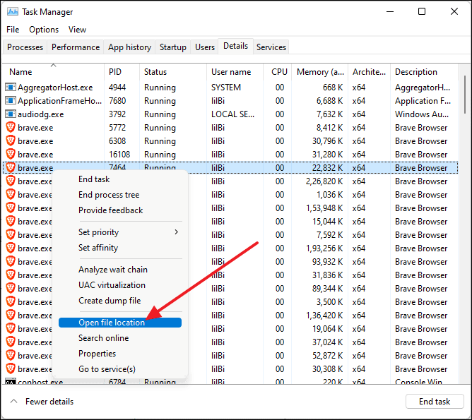 Ctrl+Shift+Escor by searching for it in the Start Menu. - Click on the Details tab to view all running processes.