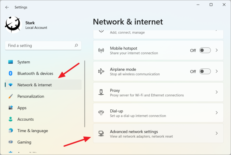 Step 2: In Settings, select the Network & internet tab on the left pane. Then, on the right, scroll down and click on Advanced network settings.